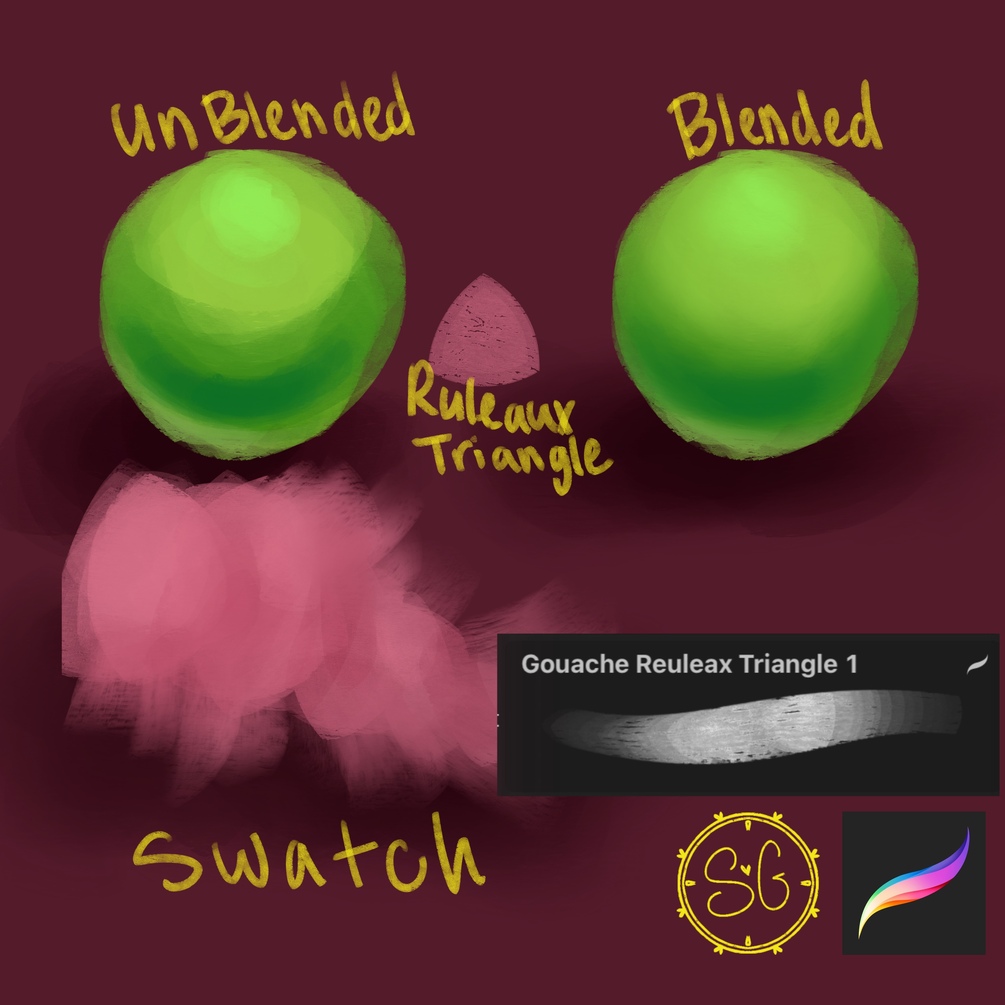 Perfectly created and modified gouache brush in the shape of a ruleaux triangle for optimal texture and interest. Blending is a dream with this brush.